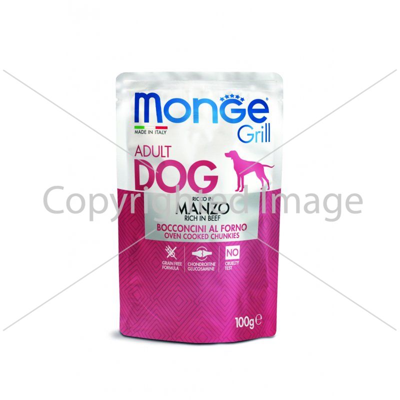 Monge Dog Grill Pouch паучи для собак с говядиной. Полноценное сбалансированное питание для взрослых собак всех пород. Корм изготовлен из запеченного мяса говядины, не содержит злаков. Формула содержит глюкозамин и хондроитин для поддержания здоровья суставов.