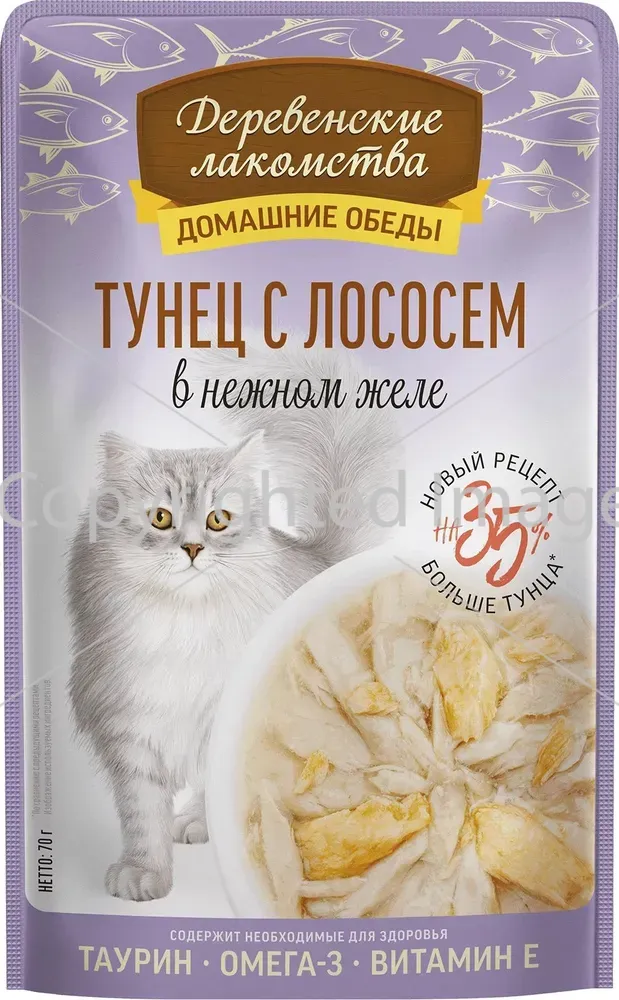 Влажный корм для кошек "Деревенские лакомства домашние обеды" Тунец с лососем в нежном желе, пауч 70 гр "Деревенские лакомства домашние обеды" Тунец с лососем в нежном желе